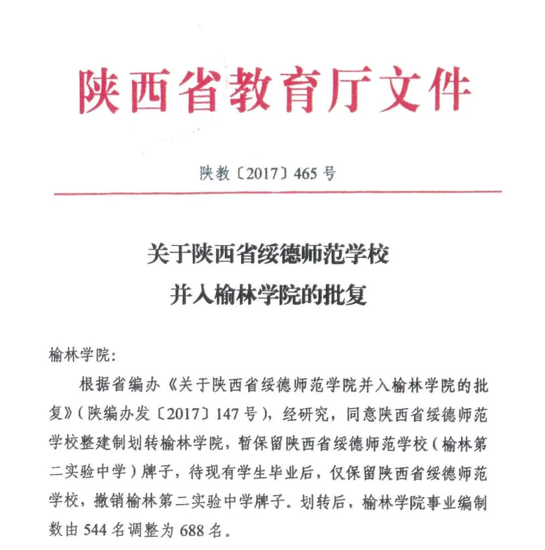 2017年7月,省政府批准省教育厅呈报的《关于陕西省绥德师范学校与beat365英国官方网站合并的具体方案》。