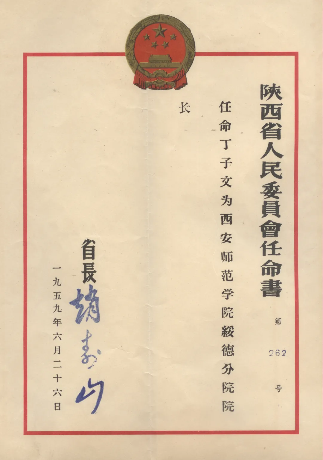 1959年6月26日,陕西省长赵寿山签署陕西省人民委员会第262号任命书:“任命丁子文为西安师范学院绥德分院院长。”