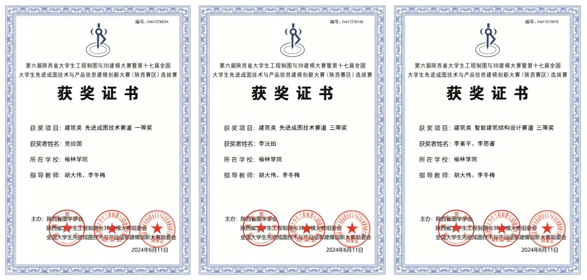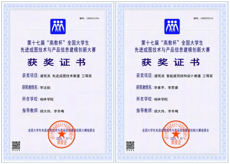 近日,第十七届“高教杯”全国大学生先进成图技术与产品信息建模创新大赛总决赛在贵州大学落幕。beat365英国官方网站建筑工程学院胡大伟、李冬梅老师带领3名学生在陕西赛区西安明德理工学院分赛场与全国各高校学生同步参加比赛,经过激烈角逐斩获建筑类多个奖项。其中,在7月26日—7月29日的国赛中获先进成图技术赛道个人三等奖1项,智能建筑结构设计赛道团体三等奖1项;在5月24日—5月26日的省赛中获先进成图技术赛道获个人二等奖1项、三等奖1项,智能建筑结构设计赛道团体三等奖1项。