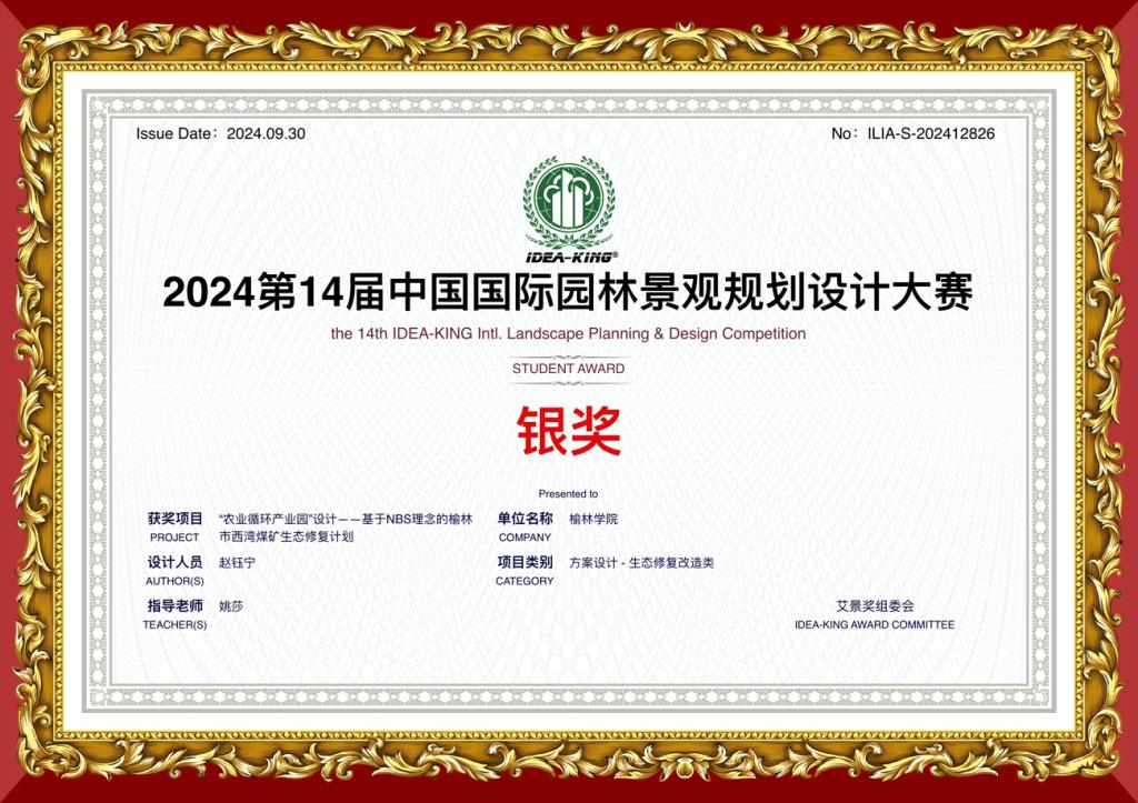 10月8日,beat365英国官方网站艺术学院环境设计专业20级学生赵钰宁以其作品《农业循环产业园”设计一一基于NBS理念的榆林市西湾煤矿生态修复计划》,在第14届中国国际园林景观规划设计大赛(艾景奖)中荣获全国银奖。