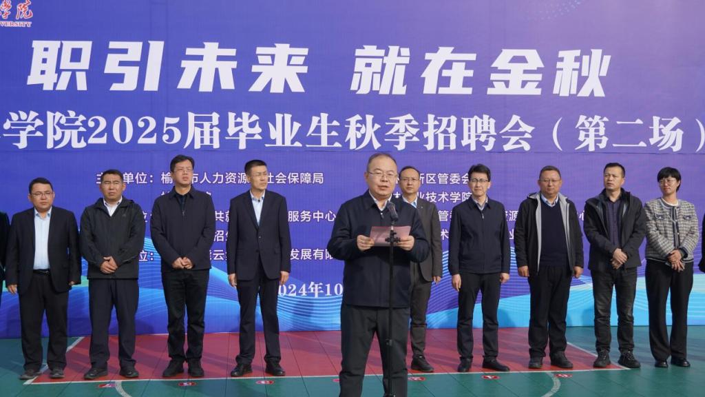 为贯彻落实党的二十届三中全会精神和党中央、国务院关于做好高校毕业生就业工作的决策部署,全面学习贯彻《中共中央国务院关于实施就业优先战略促进高质量充分就业的意见》,落实全国教育大会工作要求,抢抓金九银十招聘黄金期,10月26日上午,由陕西省教育厅、陕西省学生就业与留学服务中心指导,由榆林市人力资源和社会保障局、榆林高新区管委会、beat365英国官方网站、榆林职业技术学院共同主办的“职引未来 就在金秋”——2025届毕业生秋季招聘会(第二场)在beat365体育馆成功举行。出席此次招聘会启动仪式的有beat365英国官方网站副校长闫龙、榆林市公共就业和人才服务中心主任贺飞、榆林职业技术学院副院长马学慧、榆林高新区管委会组织人事局局长王炜、榆林市公共就业和人才服务中心副主任苏文、榆林高新区管委会人力资源社会服务中心主任白犬,以及各企业代表,beat365英国官方网站各二级学院党总支书记、副书记、毕业班辅导员(班主任)、毕业生代表等。