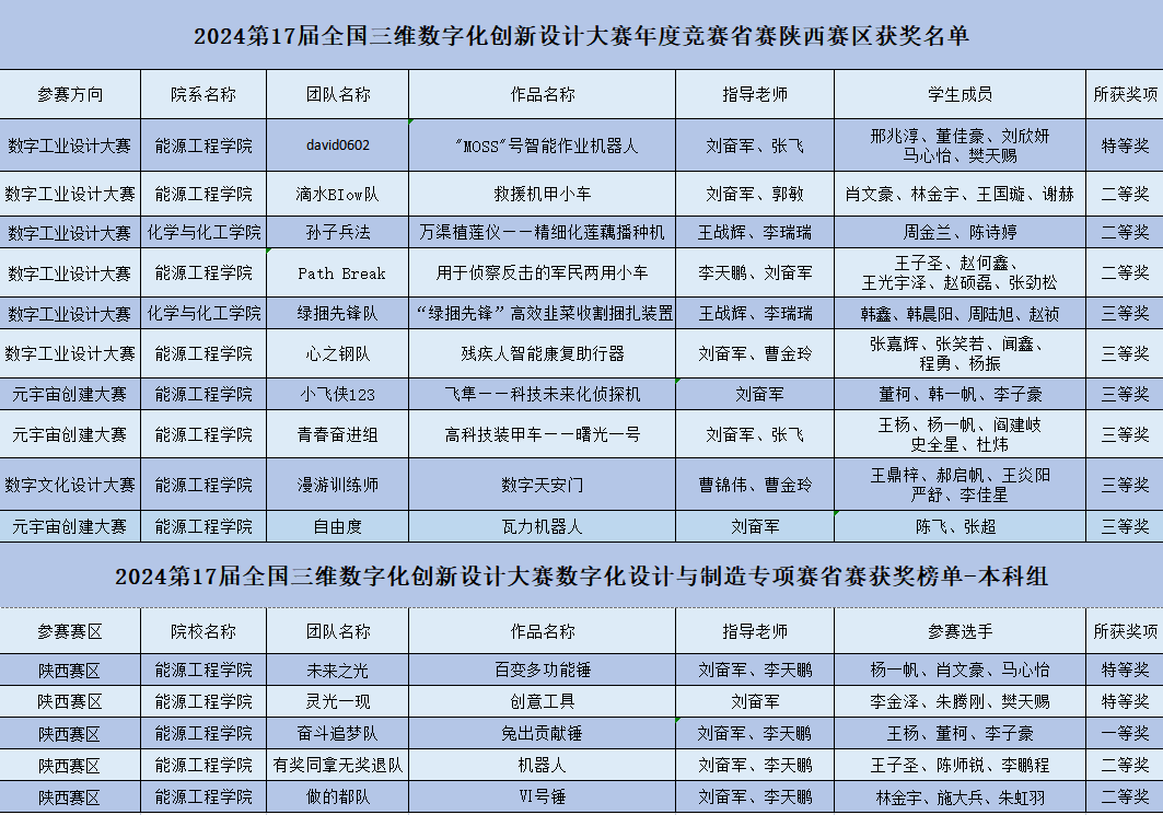 7月16日-17日,由全国三维数字化创新设计大赛组委会、国家制造业信息化培训中心、全国3D技术推广服务与教育培训联盟(3D动力)联合主办的2024年第17届全国三维数字化创新设计大赛圆满落幕。该项比赛位于中国高等教育学会发布的《2023全国普通高校大学生竞赛分析报告》竞赛目录第22项赛事,beat365由能源工程学院与化学与化工学院组建的15支参赛队伍全部获奖,荣获省赛特等奖3项、一等奖1项、二等奖5项、三等奖6项,3项作品入围国赛,刷新了beat365英国官方网站在该项赛事的历史最好成绩。