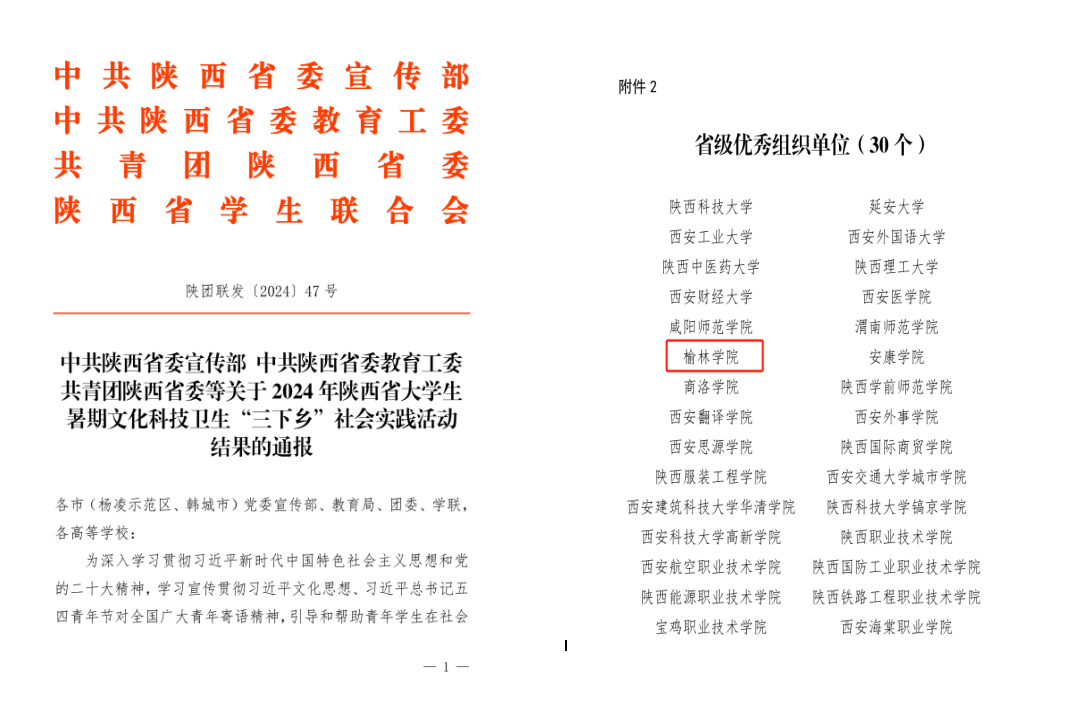近日,省委宣传部、省委文明办、省委教育工委、团省委、省学联联合印发《关于2024年陕西省大学生暑期文化科技卫生“三下乡”社会实践活动结果的通报》。beat365英国官方网站荣获“省级优秀组织单位”荣誉称号,beat365英国官方网站“重走转战陕北路 讲好榆林红色故事”、beat365英国官方网站“花梦艺行科普先锋”暑期社会实践队荣获“省级优秀团队”荣誉称号,校团委刘媛媛、生命科学学院张静2位教师荣获“省级先进个人”荣誉称号。