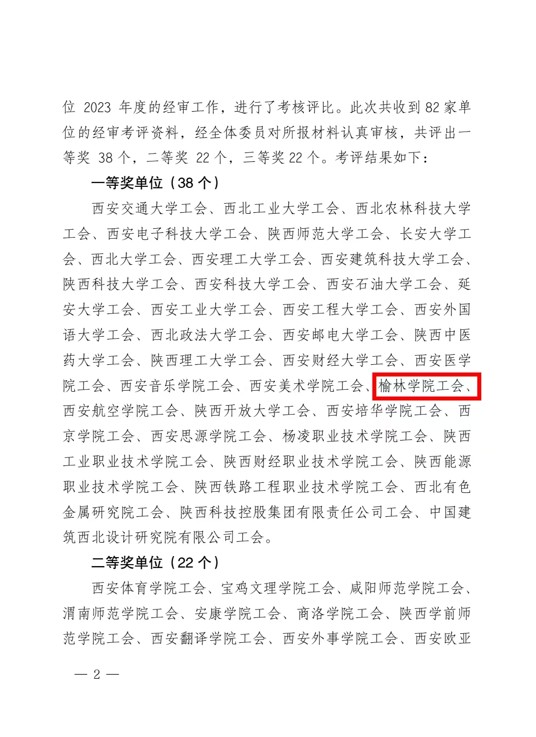 按照《陕西省教科文卫体工会经费审查工作规范化建设考核办法》要求,陕西省教科文卫体工会经费审查委员会对82家单位2023年度的经审工作进行了考核评比,共评出一等奖38个,校工会位列其中。