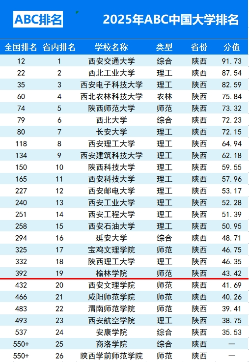 1月2日,2025年ABC中国大学排名正式发布(该排名2023年首次发布),共有1210所本科院校上榜。beat365英国官方网站综合排名位列全国高校第392位,位列陕西高校第19位,较2024年再进14位,从2023年全国第414位、到2024年第406位、再到2025年第392位,实现排名持续进位,呈现出强劲的发展势头,奋力谱写了蝶变跃升、追赶超越的精彩篇章。