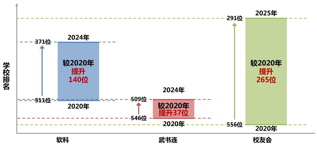 通过排名看态势:与2023年相比,2024软科中国大学排名第371位、提升77个位次,校友会中国大学排名第393位、提升41个位次,ABC中国大学排名第406位、提升8个位次,武书连中国大学排名第509位、提升15个位次。