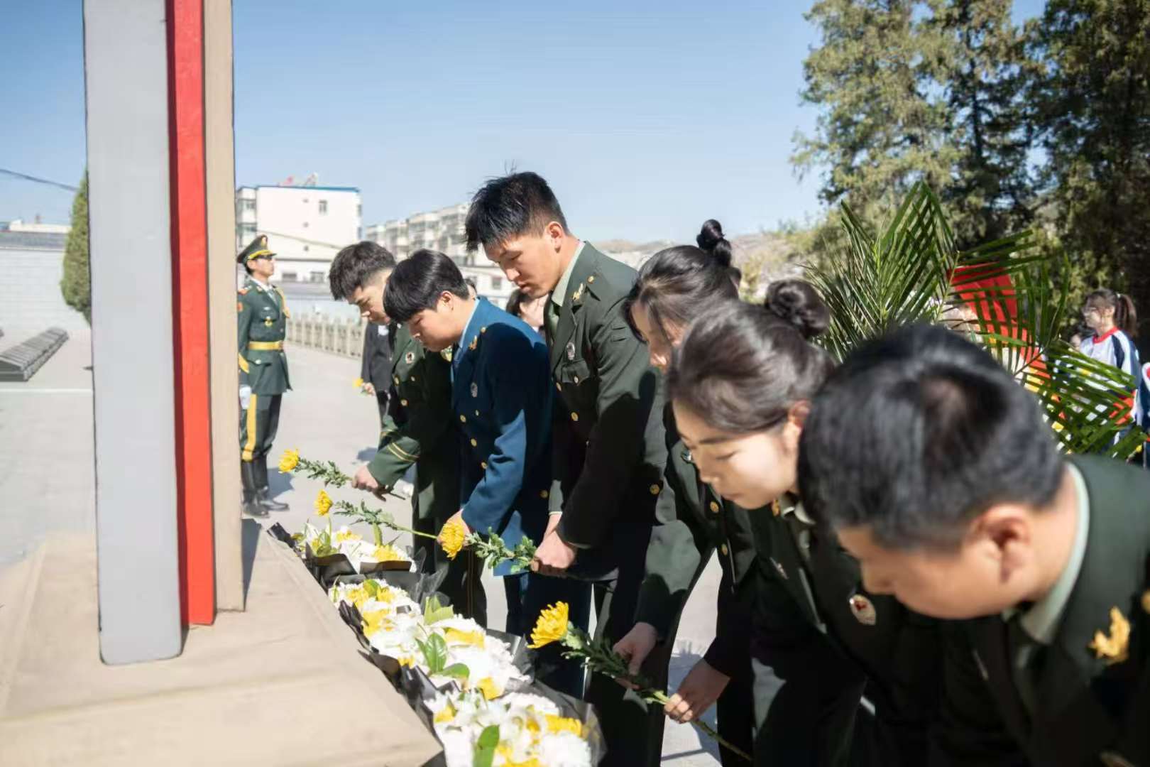 beat365英国官方网站国旗护卫队向革命烈士纪念塔敬献花篮,姚学慧、贺心睿、黑耀飞、封蕾上前整理花篮缎带,全体人员向为革命事业英勇献身的烈士们鞠躬致敬。