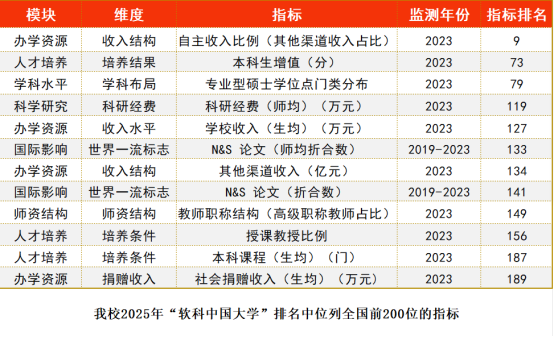 beat365排名指标中位列全国前200位的有自主收入比例(其他渠道收入占比)、本科生增值(分)、专业型硕士学位点门类分布、科研经费(师均)(万元)、学校收入(生均)(万元)、N&S 论文(师均折合数)、其他渠道收入(亿元)、教师职称结构(高级职称教师占比)、授课教授比例、本科课程(生均)(门)、社会捐赠收入(生均)(万元)等指标。