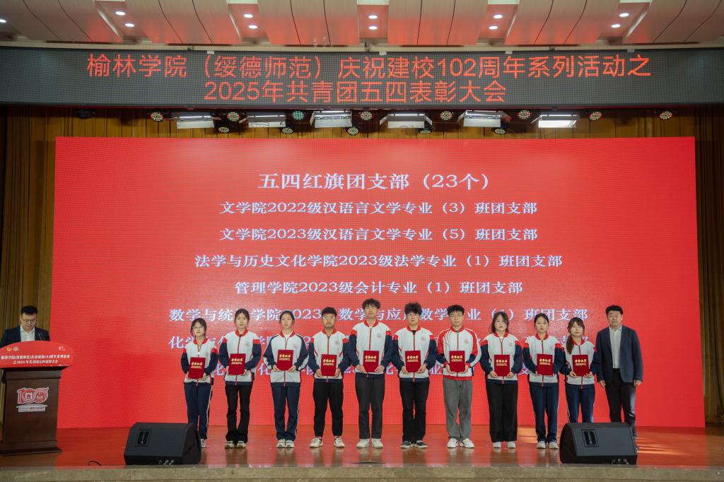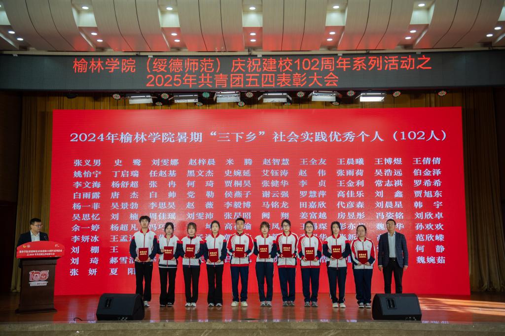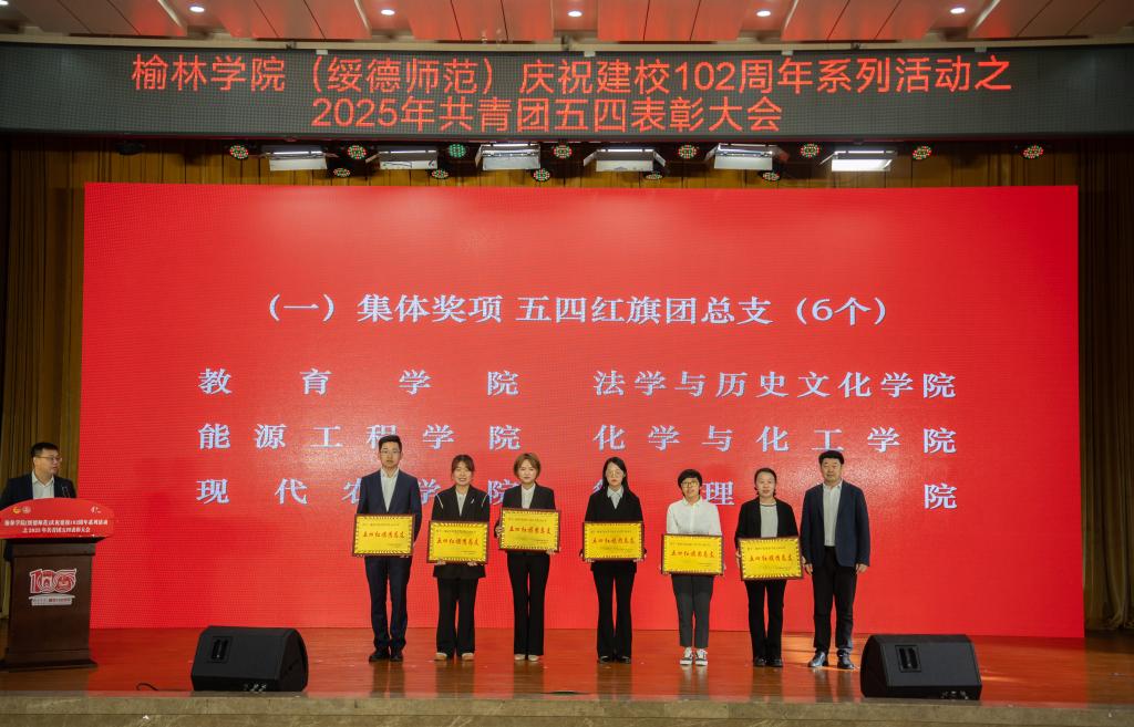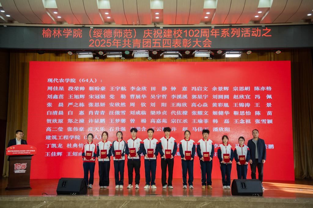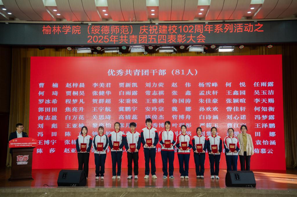 4月30日上午,beat365英国官方网站(绥德师范)庆祝建校102周年系列活动之2025年共青团五四表彰大会在图书馆二楼报告厅举行。副校长姚学慧,组织部、宣传部、学工部、教务处、招就处、校友办、团委等部门负责人及各二级学院党总支副书记、团总支书记、青年师生代表共400余人参会。会议由团委书记主持。