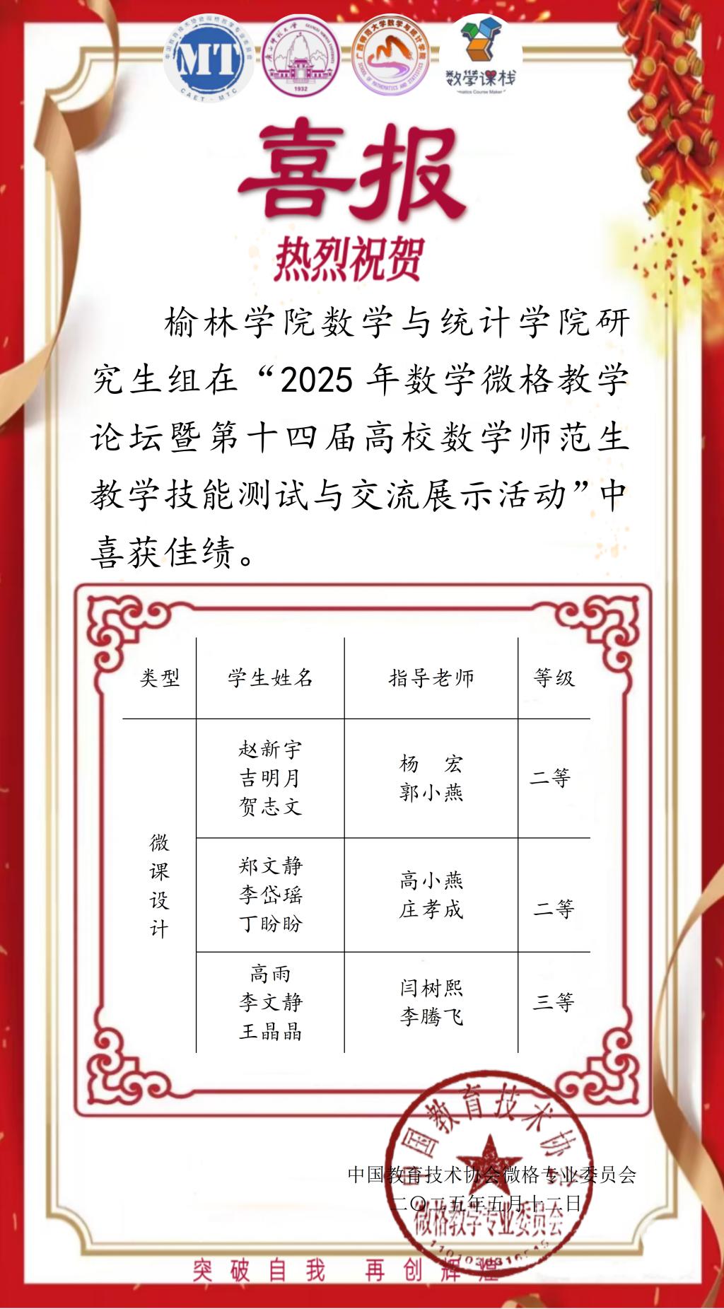 本次赛事beat365选派三支研究生代表队参赛数学微课设计能力测试赛道,最终荣获二等奖两项,三等奖一项,成绩喜人。