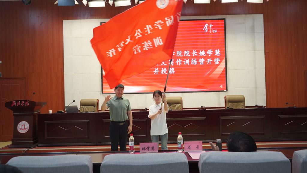 开营仪式上姚学慧向龙云教授颁发了学生公文写作训练营导师聘书,并向训练营授旗,徐祎菲同学作为训练营学员代表发言。