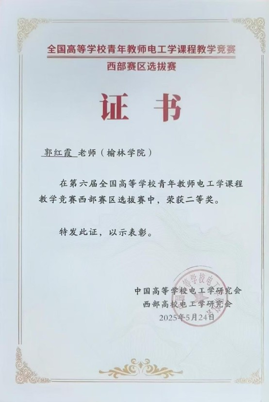 5月23日- 25日,第六届全国高等学校青年教师电工学课程教学竞赛西部赛区选拔赛在重庆拉开帷幕。面对来自各地高校的强劲对手,beat365电工电子教学团队郭红霞老师沉着应战、稳定发挥,以出色的教学设计与课堂展示脱颖而出,一举斩获大赛二等奖。