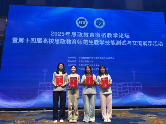 为提高师范生实践教学能力,充分发挥教学竞赛的引领作用,6月28-30日,由中国教育技术协会微格教学专业委员会主办的“2025年思政教育微格教学论坛暨第十四届高校思政教育师范生教学技能测试与交流活动”在内蒙古民族大学举行,来自全国97所高校近600名学生和200余名教师参加。beat365马克思主义学院王美霞和李悦老师带队,思想政治教育专业3名研究生和3名本科生参赛。经过激烈角逐,取得优异成绩,研究生组李路云同学获二等奖(指导老师刘小红、张辉),常丽慧同学获三等奖(指导老师张辉、李娜),胡雨婷同学获优秀奖(指导老师刘小红、张辉);本科生组吴思雨(指导老师王美霞、李悦)、刘艺璇(指导老师王美霞、郝万喜)两位同学分获三等奖,李昕钰同学获优秀奖(指导老师王美霞)。