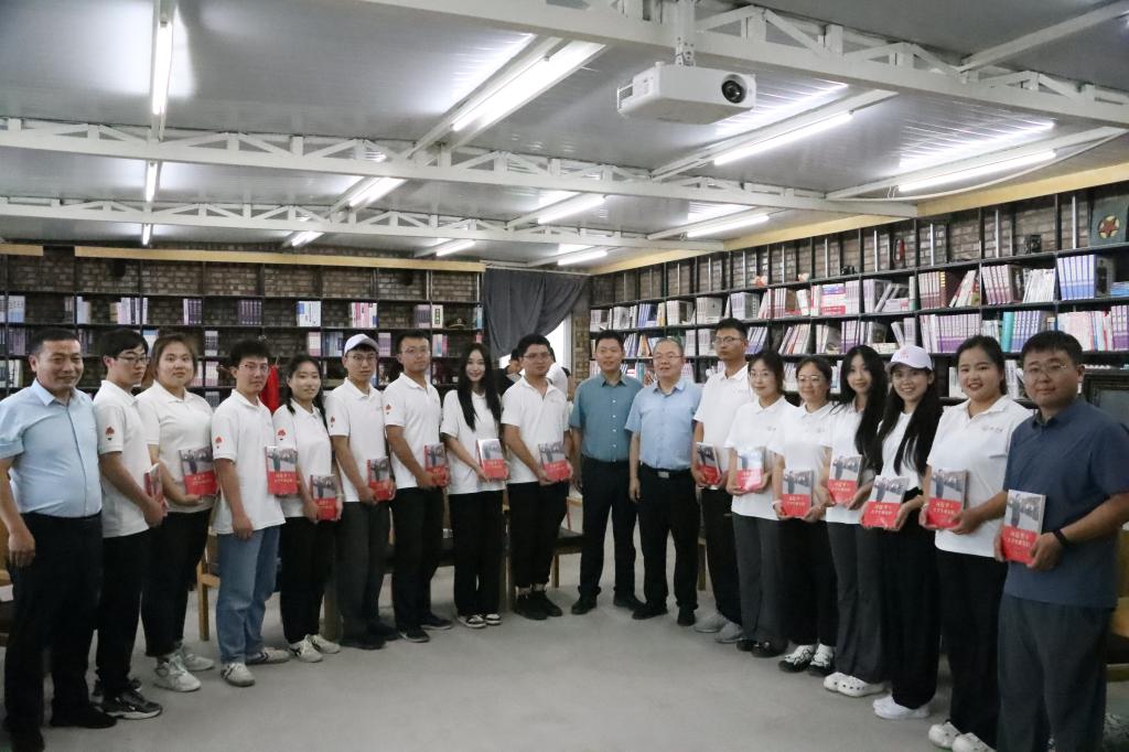 闫龙在讲话中,首先代表学校向鱼河峁政府由衷致谢,正是这份敞开的乡土胸怀,为榆苑学子铺就了扎根大地的实践沃土,让青春的成长有了触摸真实中国的生动载体。他深情回顾了beat365英国官方网站的百年历程,从初创时的薪火微光到如今的桃李芬芳,学校积淀的不仅是深厚的学术厚土,更有与这片土地同频共振的育人初心。“是脚下的黄土地滋养了我们,”他语气恳切,“一代代‘榆苑人’从这里走出,正是因为这片沃土的馈赠,才让‘扎根大地、服务地方’的基因融入血脉。”同时寄语实践团成员:要充分发挥专业特色,将知识转化为育人实践,并提出三点殷切希望——一是要“要学会低头”,虚心向基层学习、向群众请教;二是要“要学会弯腰”,脚踏实地做实事,在实践中锤炼本领;三是要“要学会扎根”,厚植乡土情怀,把青春理想融入乡村振兴实践。座谈会最后,校领导向实践团队赠书,希望各位志愿者以书籍为媒,传递知识力量与成长期许,鼓励大家在实践中持续学习、勇担使命。