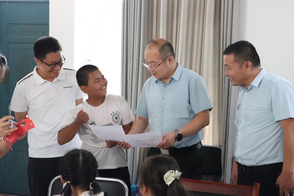 校领导一行首先步入支教课堂,实地察看团队支教服务的课程成效。课堂上,同学们整齐列队,唱起音乐课所学的《南泥湾》——稚嫩的嗓音里裹着昂扬的朝气,“花篮的花儿香,听我来唱一唱”的旋律刚起,便牵动了在场所有人的心。大家驻足聆听,望着孩子们眼中的认真与热忱,不自觉地跟着旋律轻打节拍,渐渐融入合唱之中。歌声未落,剪纸课堂的巧思已在一旁静静等候。孩子们的刀工虽带着几分孩童特有的拙朴——有的线条歪歪扭扭,有的边角还留着未剪净的毛边,可恰恰是这份不完美里,藏着最真挚的创造力:每一刀下去,都是他们对“英雄”的想象;每一处剪痕,都印着实践队手把手教学的耐心。