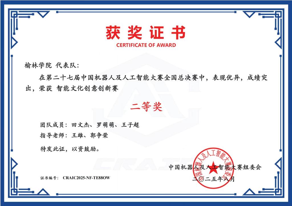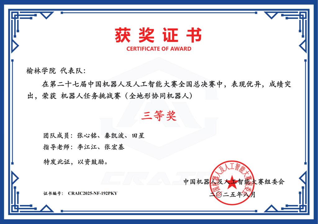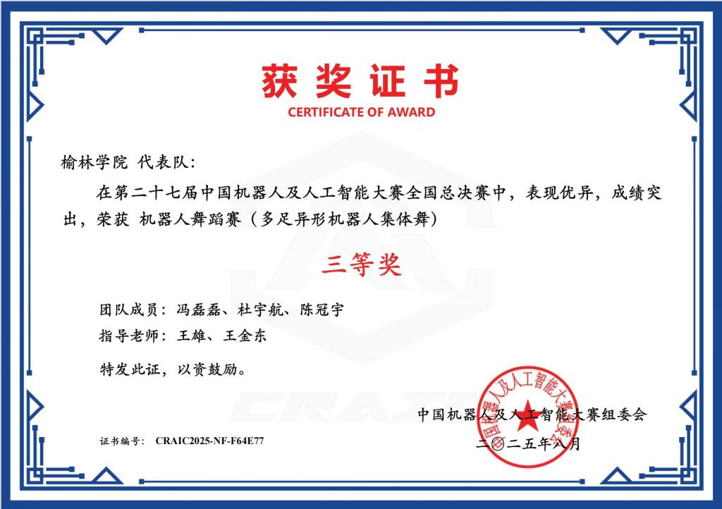 继在陕西省赛中突出重围后,beat365三支代表队在全国总决赛中持续发力。由田文杰、罗萌萌、王子超组成的团队,凭借对智能文化创新创意赛的深刻理解与精湛技术,在众多作品中脱颖而出,荣获二等奖;冯磊磊、杜宇航、陈冠宇团队则以灵动的机器人舞蹈设计,在机器人舞蹈赛中斩获三等奖;张心铭、秦凯波、田星团队在全地形协同机器人挑战赛中,凭借对复杂地形的精准应对,同样收获三等奖。