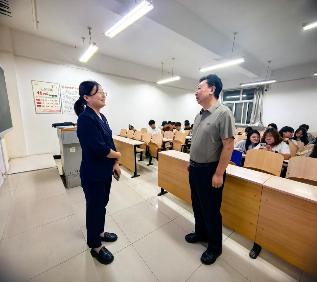 党委书记张新柱先后听取了马克思主义学院耿宏宏老师讲授的《马克思主义发展史》、马举魁老师讲授的《形势与政策》以及艾霞老师讲授的《毛泽东思想和中国特色社会主义理论体系概论》课程。张新柱在课间与师生交流时指出,授课教师准备充分,课堂教学组织有序,教学方法灵活多样,善于运用在线教学平台进行考勤、提问等辅助教学,展现了扎实的专业功底和精湛的教学艺术。师生互动自然流畅,课堂气氛活跃,有效激发了学生的学习兴趣和主动性,实现了知识传授、能力培养和价值引领的有机统一。他强调,思政课是落实立德树人根本任务的关键课程,教师要以“大思政”理念重构教学内容,将党的最新理论融入课堂,引导学生树立正确价值观。在人工智能快速发展的新时代,教师要主动将人工智能等新技术融入教学过程,创新教学方法和手段,提升教学效果,培养学生适应未来社会发展的能力。