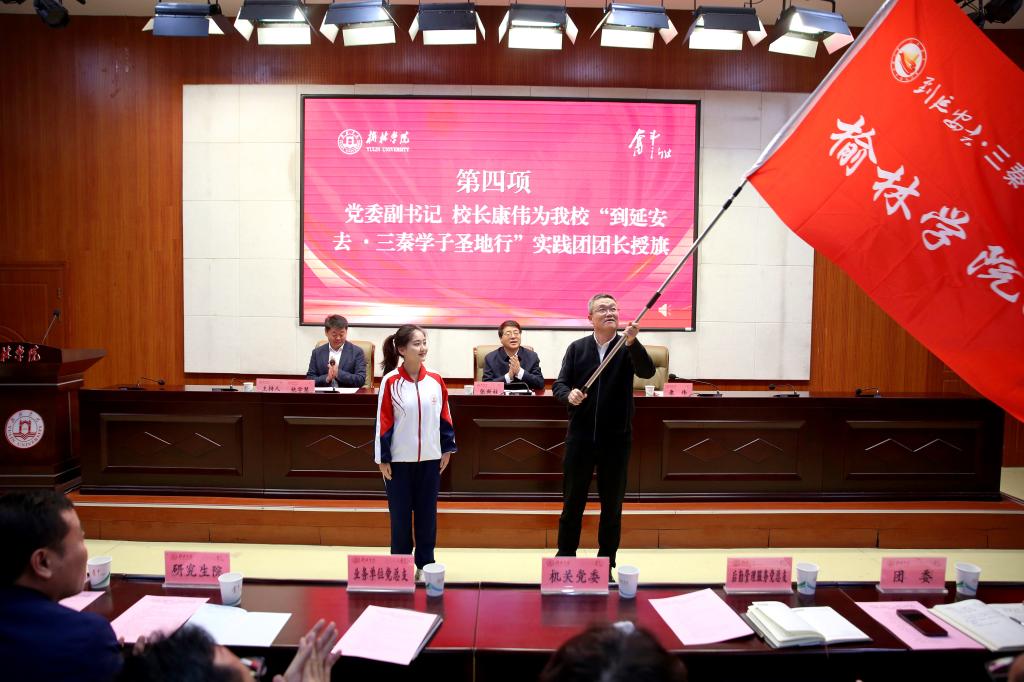 张新柱在讲话中指出,“到延安去”·三秦学子圣地行和“走进公寓问需求•畅谈平凡话奋斗”活动是学校深入学习贯彻习近平新时代中国特色社会主义思想,特别是关于青年工作、关于教育的重要论述,落实立德树人根本任务的一项重要举措,也是学校赓续红色血脉、筑牢育人阵地、激励奋斗精神的一次生动实践,意义重大。他向与会师生提出三点希望:一是到延安去,汲取延安精神的伟大力量。延安是中国革命的摇篮,是中国共产党人的精神家园。通过“到延安去”的实践活动,引导广大师生深刻感悟和主动汲取延安精神的四种力量。一要从延安精神中汲取信仰力量,坚定对马克思主义的信仰、对社会主义和共产主义的信念,筑牢信仰之基、补足精神之钙、把稳思想之舵,始终保持政治定力;二要从延安精神中汲取思想力量,坚持解放思想、实事求是的思想路线,坚持一切从实际出发、理论联系实际,深入分析面临的机遇挑战,着力破解发展中的难题,不断推动各项事业取得新突破;三要从延安精神中汲取初心力量,深刻领会“全心全意为人民服务”的根本宗旨,落实立德树人根本任务,牢固树立以学生为中心的发展理念,解决学生急难愁盼问题,不断增强学生的获得感、幸福感、安全感;四要从延安精神中汲取奋斗力量,发扬自力更生、艰苦奋斗的创业精神,以一往无前的奋斗姿态和永不懈怠的精神状态,为学校高质量发展作出更大的贡献。二是读《平凡的世界》,跟着路遥去奋斗。路遥是陕北黄土地的优秀儿子,他的代表作《平凡的世界》感动了无数读者,激励了一代又一代青年。我们要学习路遥,践行四个奋斗。一要艰苦奋斗,在苦难中领悟人生真谛,在逆境中磨砺意志,在拼搏中开拓人生,不惧艰难险阻,勇往直前,在平凡的岗位上创造不平凡的业绩;二要主动奋斗,在平凡中追求卓越,在主动中开创新局,主动将个人发展融入时代洪流和国家需要,在服务奉献中实现人生价值;三要激情奋斗,路遥本人用生命写作,其作品中的人物也对生活充满热爱与激情。这种“热泪盈眶”的激情,是干事创业的“催化剂”;四要持续奋斗,路遥创作《平凡的世界》用了整整六年时间,这种“咬定青山不放松”的执着精神令人敬佩。奋斗并非一朝一夕之事,只有长期坚持和不懈努力,才能最终实现自己的人生理想。三是全面建强一流应用型大学,培养胸怀天下身怀良技心怀情趣的一流应用型人才。汲取精神力量,标定奋斗范式,最终要落脚于办学实践。一要构建“三角形”育人体系,培养一流应用型人才。根据国家战略和榆林产业需求调整专业,建立“专业+人工智能+五乐育人”的人才培养体系,促进学生全面发展,提高人才培养质量;二要深化“思政四部曲”,扣好人生第一粒扣子。通过参观百年校史馆、观看原创红色话剧《李子洲在1929》、阅读文学经典《平凡的世界》和聆听劳模故事,教育引导学生坚定理想信念、树立远大志向,奋力跑出当代青年的最好成绩;三要践行五乐育人,做全面发展的时代新人。不断深化“五乐育人”工程(乐讲铸魂、乐读启智、乐跑强体、乐唱育美、乐劳塑品),锻造胸怀天下身怀良技心怀情趣的真本领,培养既有坚定理想信念、又有扎实能力本领,既敢于担当作为、又富有生活情趣的德智体美劳全面发展的新时代栋梁之才;四要实施新“六个一”战略举措,全面建强一流应用型大学。深入实施“一个遵循、一个根本、一个战略、一个战术、一个关键、一个保障”新“六个一”战略举措,坚持有所为有所不为,从平原迈向高原,全面建强一流应用型大学,保障学生在未来的人生道路上走得快、走得稳、走得顺、走得好。