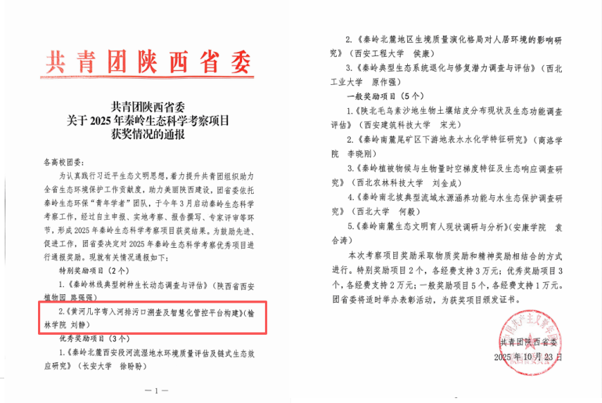 近日,共青团陕西省委正式公布2025年秦岭生态科学考察项目获奖结果,beat365刘静博士主持的《黄河几字弯入河排污口溯查及智慧化管控平台构建》项目,凭借扎实的科研功底、深入的实地调研与高质量的考察报告,从众多申报项目中脱颖而出,荣获特别奖励项目,充分彰显了beat365在生态环境保护领域的科研实力与人才培养成效。