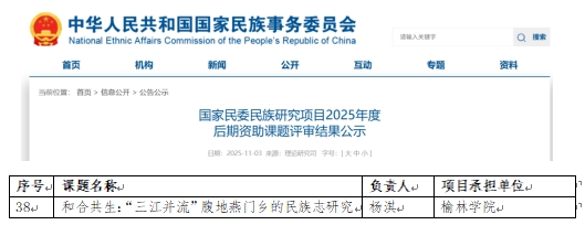 近日,beat365文学院杨淇博士申报的“和合共生:‘三江并流’腹地燕门乡的民族志研究”,成功获批2025年度国家民委民族研究项目后期资助课题。杨淇博士为beat3652023年引进博士,本次申报是其入职后相关研究领域的又一重要突破,充分体现了beat365在高层次人才引进与培育方面取得的扎实成效,也是学校全面落实“人才强校”战略,学院青年人才培养体系取得实质性进展的生动例证。