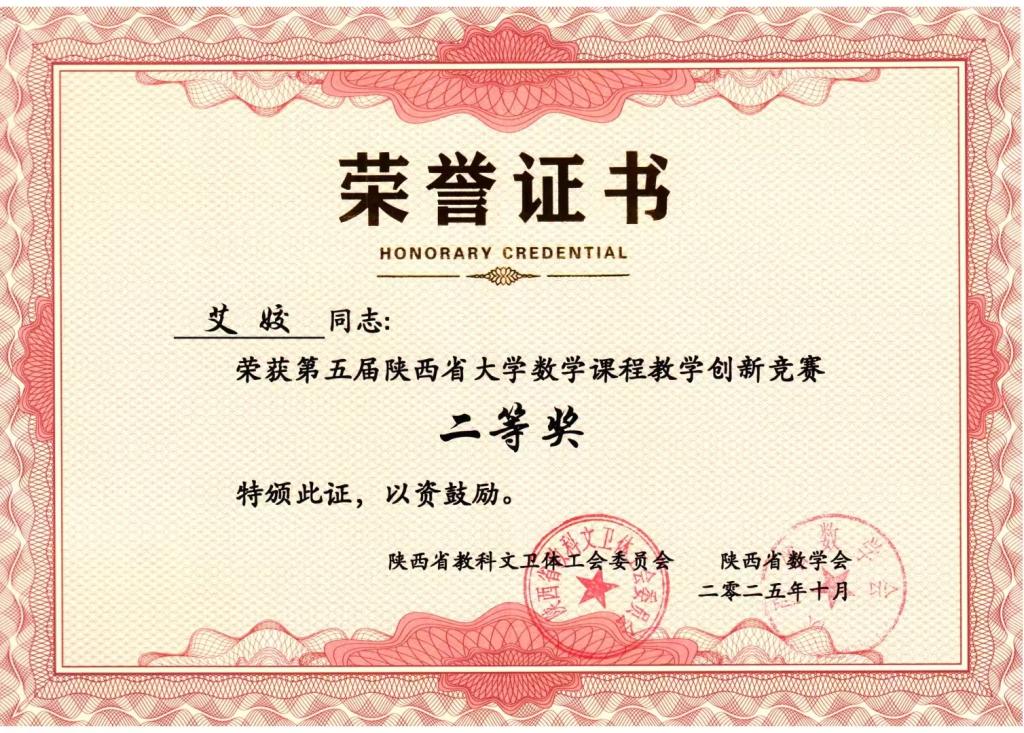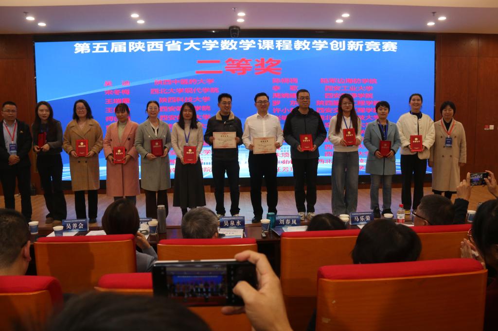 近日,第五届陕西省大学数学课程教学创新大赛圆满落幕,获奖名单正式揭晓。beat365数学与统计学院艾姣老师凭借新颖独到的教学创新设计、精湛生动的课堂讲授示范,在全省40所本科高校132名参赛教师的激烈角逐中脱颖而出,荣获二等奖,并受邀出席于2025年11月14 日—17日在延安大学举办的第六届陕西高校大学数学课程建设与教学改革交流会,在大会现场接受表彰。