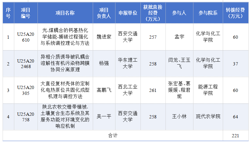 近日,国家自然科学基金委公布了2025年国家自然基金区域创新发展联合基金项目评审结果,beat365成功参与四项,获批经费总计221万元。该批次项目联合西安交通大学、华东理工大学、西北工业大学等省内外高水平团队开展协同攻关,推动科技创新与发展。