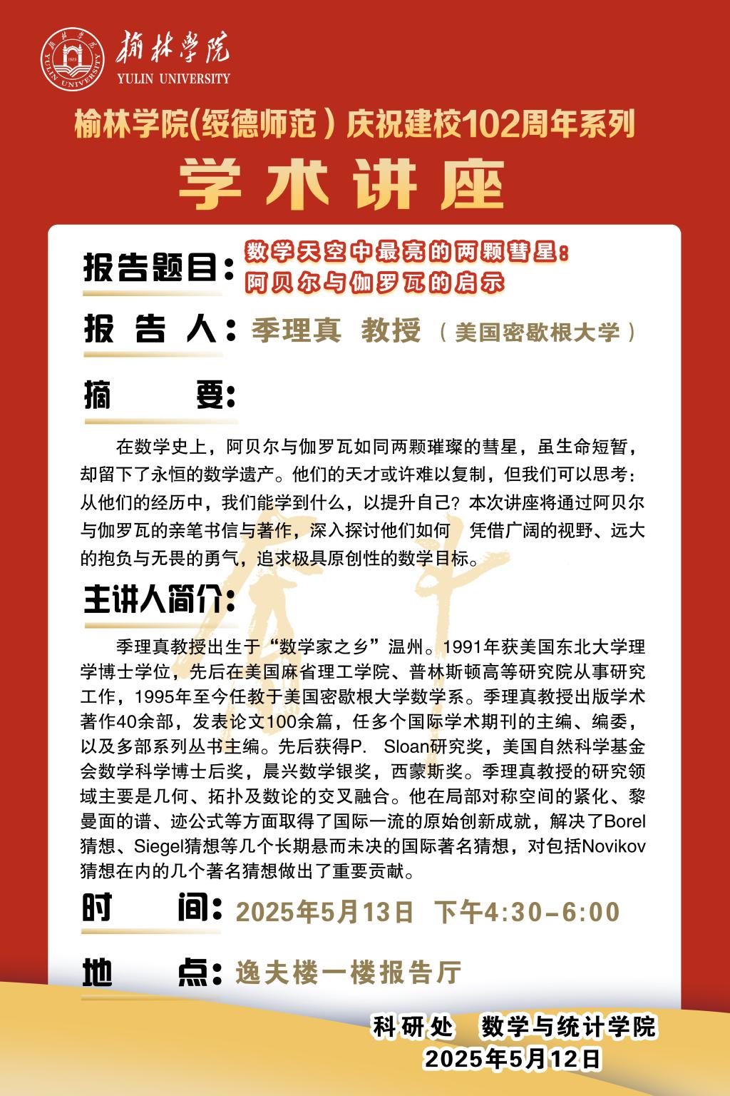 2025年学术交流活动(十一) 题目:数学天空中最亮的两颗彗星: 阿贝尔与伽罗瓦的启示
