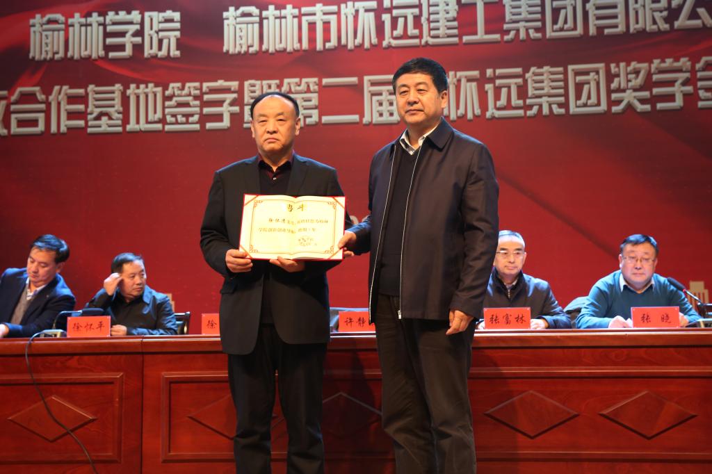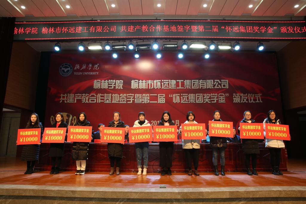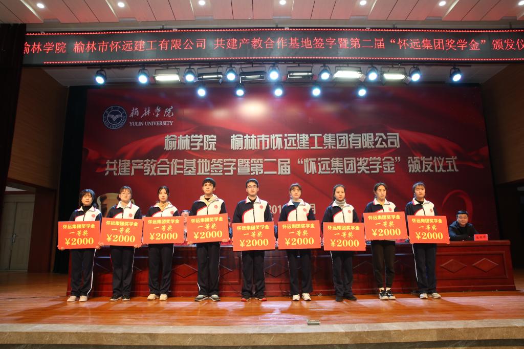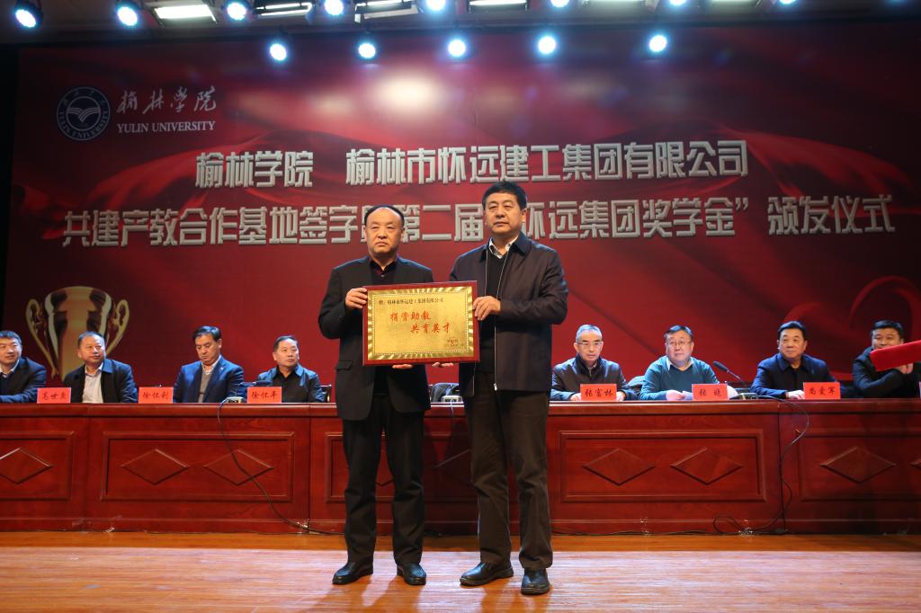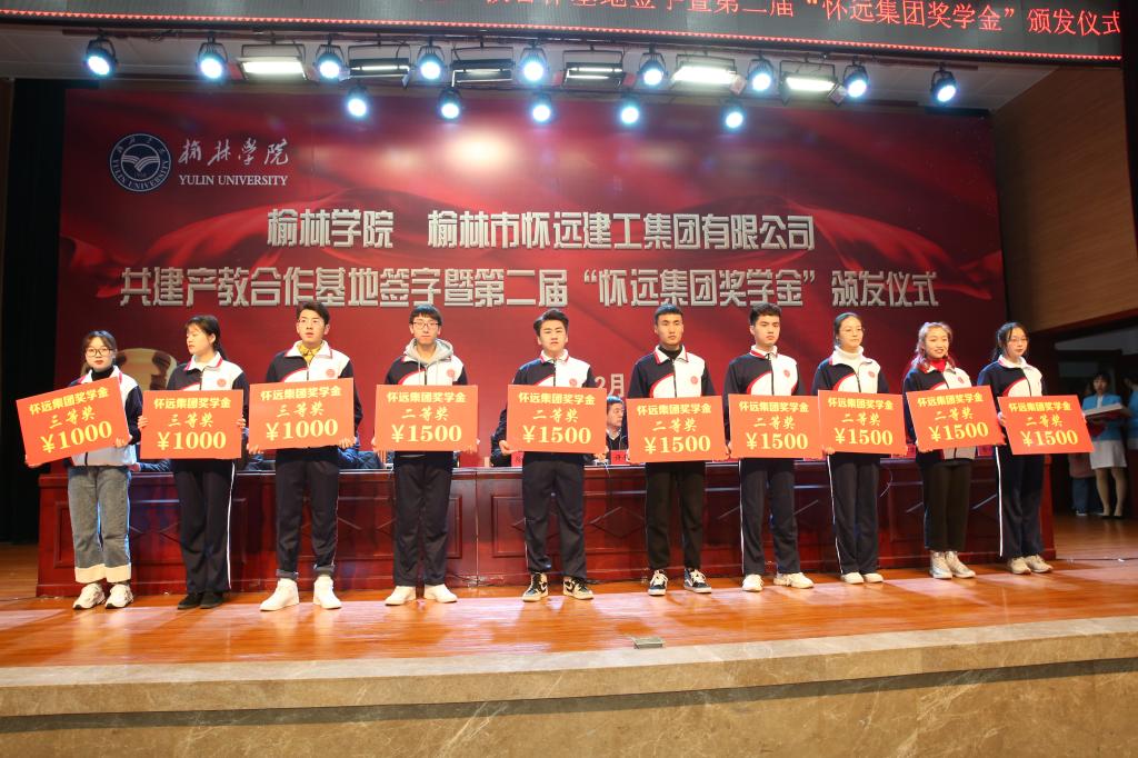 2019年12月16日下午,beat365与榆林市怀远建工集团有限公司共建产教合作基地签字暨第二届“怀远集团奖学金”颁发仪式在校图书楼学术报告厅举行。怀远建工集团两年累计出资70万元,共资助beat365217名本科生;今年还奖励了beat365录取的首届研究生35人, 每人10000元。