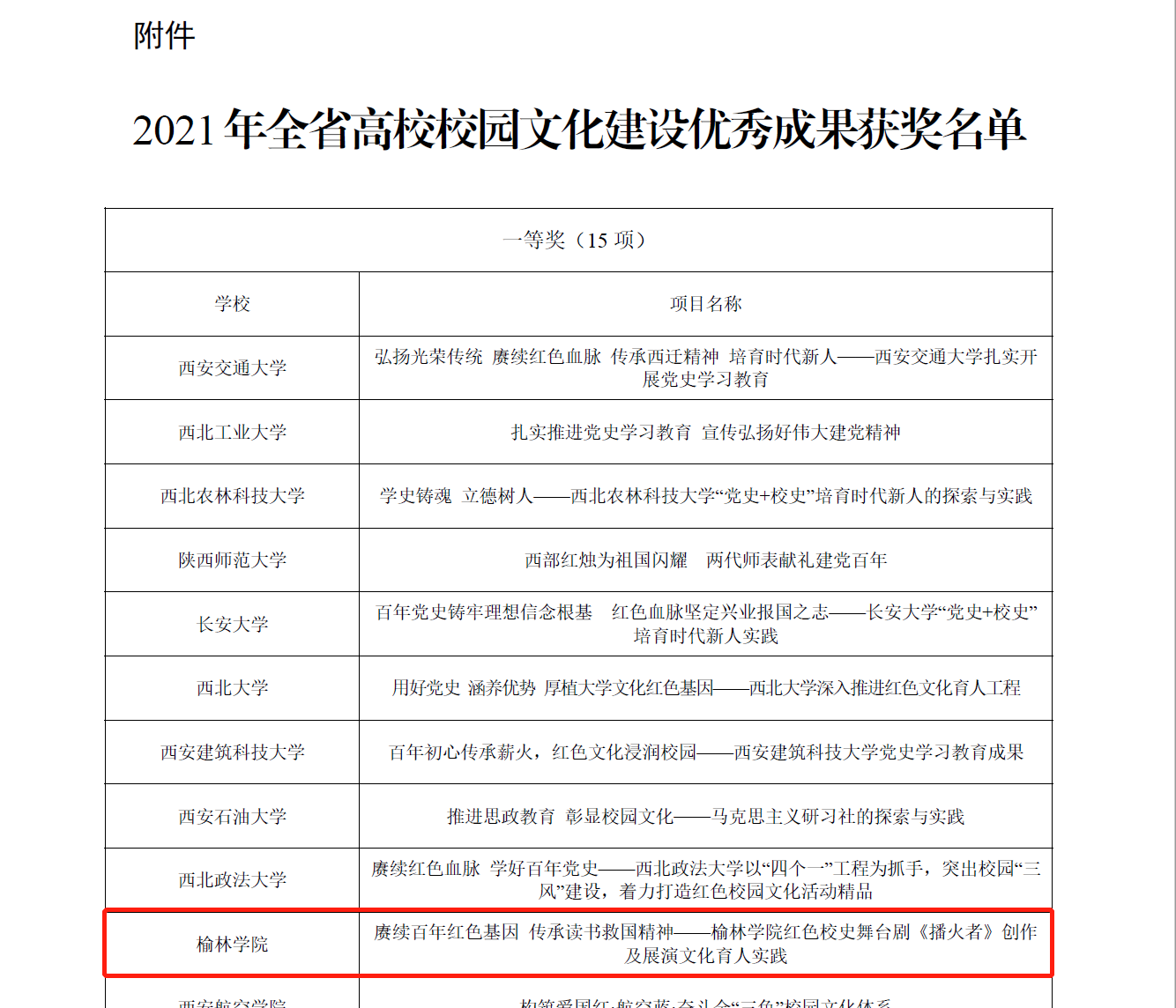3月16日,中共陕西省委教育工委发文,通报了2021年陕西省高校校园文化建设优秀成果评选结果,beat365申报的“赓续百年红色基因 传承读书救国精神——beat365英国官方网站红色校史舞台剧《播火者》创作及展演文化育人实践”获得一等奖。这是beat365认真学习践行习近平总书记考察调研榆林时提出“要充分运用红色资源,深化党史学习教育,赓续红色血脉”重要指示精神的最生动体现,是beat365扎实特色开展党史学习教育取得实际成果的有力证明,是beat365深入挖掘绥师红色资源,促使红色绥师持续“破圈”的必然结果。