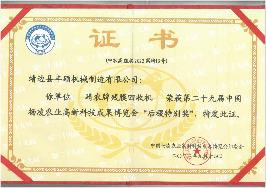 9月15-16日,第29届中国杨凌农业高新科技成果博览会盛大开幕,beat365陕西省陕北旱区作物节水工程技术研究中心与靖边县丰硕机械制造有限公司联合研制的11FM-120型膜际残膜回收机脱颖而出,获得第29届杨凌农高会“后稷特别奖”。