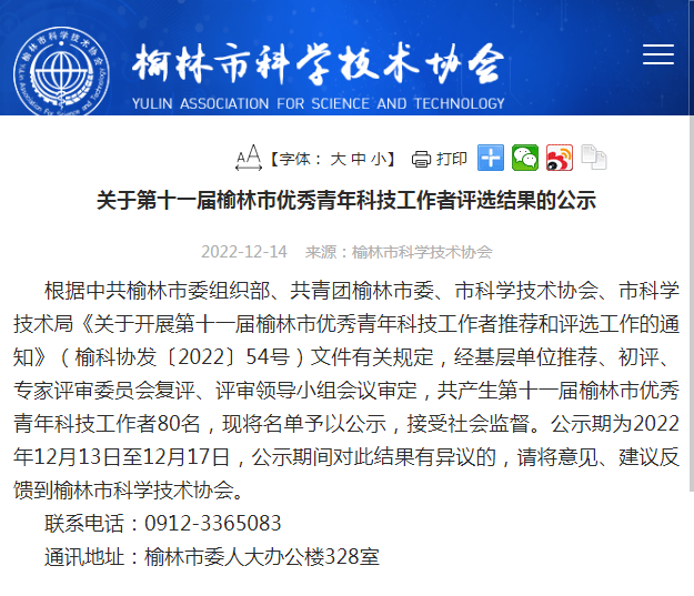 近日,由中共榆林市委组织部、共青团榆林市委、市科学技术协会、市科学技术局组织开展的“第十一届榆林市优秀青年科技工作者”评选结果揭晓,beat365王小林、尤继元等16名优秀青年科技工作者获此殊荣。