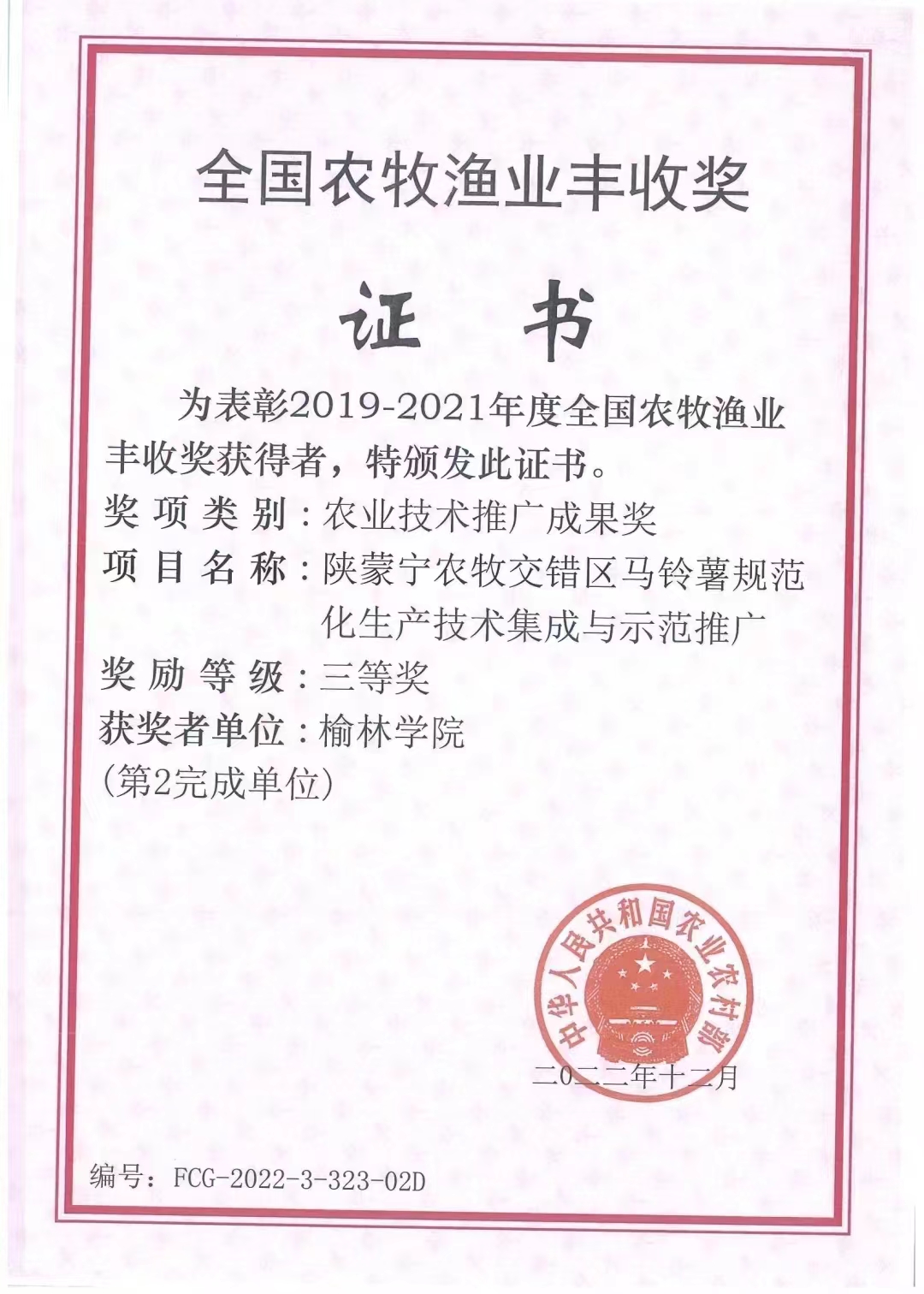近日,从省农业农村厅获悉,由beat365英国官方网站教育学院、榆林市农业科学研究院等单位共同申报的《陕蒙宁农牧交错区马铃薯规范化生产技术集成与示范推厂》荣获全国农牧渔业丰收奖三等奖。