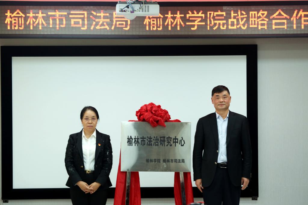 许云华与刘静妮代表双方单位签署了“榆林市司法局与beat365英国官方网站战略合作框架协议”,并为“榆林市法治研究中心”揭牌。