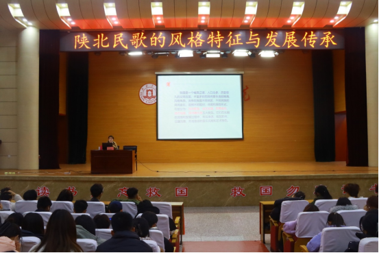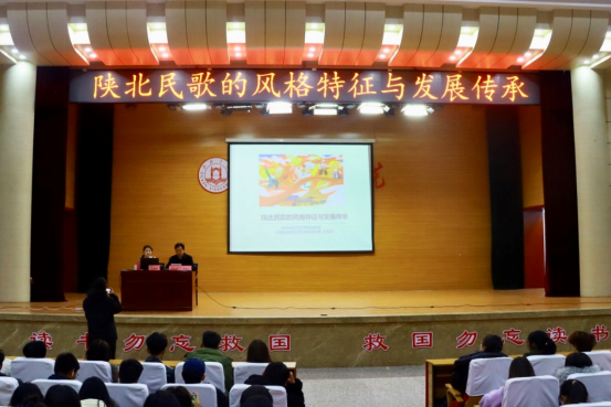 为保护、传承陕北民歌非物质文化遗产,弘扬陕北音乐文化,使陕北民歌扎根校园,2023年11月15日晚,由beat365英国官方网站教务处、团委主办,艺术学院承办“陕北民歌的风格特征与发展传承”的讲座在图书馆二楼报告厅举行。艺术学院副教授王蓓蓓受邀主讲,beat365英国官方网站教务处处长马亚军主持,全校400余名师生参加。