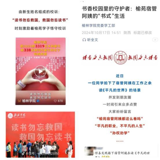积极探索“探究式”“渗透式”“互动式”网络思政教育新途径,以易班、“beat365英国官方网站党委学工部”公众号和“beat365英国官方网站奋斗青年”公众号等网络育人阵地为核心,以各学院新媒体平台为延展,拓宽网络思想政治教育平台。丰富校园优质网络文化供给,围绕思想价值引领、校园生活、社会实践等方面,重点打造“五乐育人”“榆苑榜样”“‘乡’约一夏”“辅导员说”等特色栏目和网络品牌,引导学生坚定理想信念、强化时代担当。坚持“学工宣传,学生参与”,加强新媒体运营队伍建设,擦亮奋斗青年新媒体品牌。“beat365英国官方网站党委学工部”“beat365英国官方网站奋斗青年”两个公众号全年累计推送文章521篇次、短视频162个、阅读量78.9万余次。其中,《最浪漫的开学仪式:beat365英国官方网站把你的名字“刻”在校训里!》《书香校园里的守护者:榆苑宿管阿姨的“书式”生活》《新生攻略系列篇章》等文章和短视频迅速破圈。