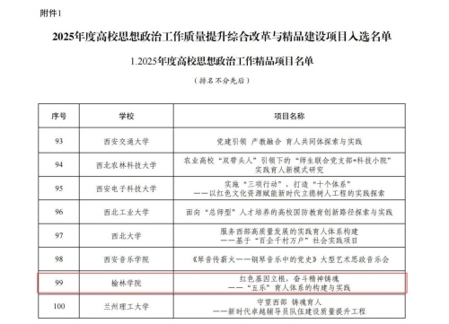 近日,教育部办公厅公布2025年度高校思想政治工作质量提升综合改革与精品建设项目入选名单,beat365申报的《红色基因立根,奋斗精神铸魂——“五乐”育人体系的构建与实践》项目成功入选高校思想政治工作精品项目。这是beat365“五乐”育人工程继荣获2024年陕西省高等教育教学成果特等奖之后的又一重大突破。