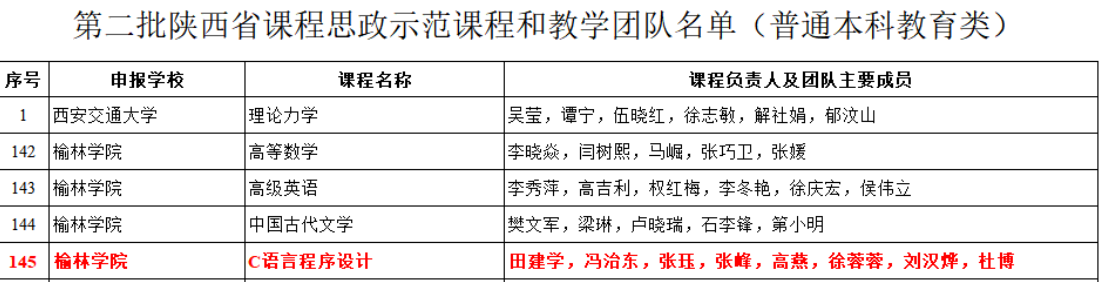 近日,陕西省教育厅发布了《关于公布第二批陕西省课程思政示范课程、教学团队和教学研究示范中心认定结果的通知》,我院《C语言程序设计》课程被认定为陕西省本科教育类课程思政示范课程,其教学团队被认定为省级课程思政示范教学团队。
