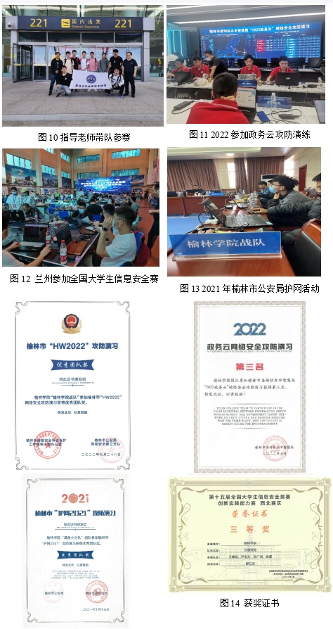 发挥技术优势,展现责任担当,积极参加社会网络安全活动。2021、2022年选派队伍参加了榆林市网信办和市智慧局组织的“政务云”攻防演练活动、榆林市公安局组织的“2021护网”和“2022护网”活动。此外,多名骨干成员作为奇安信等知名网络安全企业的团队成员参加了武汉、北京和西安等地的护网活动。