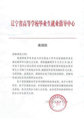 5月上旬,参报的9支大学生创业团队负责人参加了省毕业办统一组织的培训。培训期间,必赢官网软件学院2010届毕业生姚健在培训学习过程中表现突出,得到了评审专家的认可,所创办的创业项目评审综合成绩排名第一,并代表全省高校大学生创业团队进行了经验交流发言。评审及培训结束后,省教育厅毕业办特给必赢官网发来了表扬信,对姚健同学的表现给予赞誉。