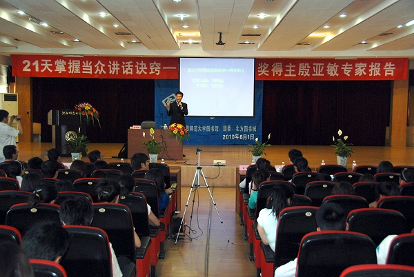 (通讯员 王 磊)6月1日下午2点,由校图书馆、团委以及北方图书城共同主办的图苑讲坛在图书馆五楼报告厅如期举行。珠海广播电视台总编辑、高级记者、第三届中国金话筒奖得主殷亚敏教授做客讲坛,为必赢官网师生带来了“21天学会当众讲话诀窍”专题报告。校团委付志平书记及300余名师生参加了报告会。