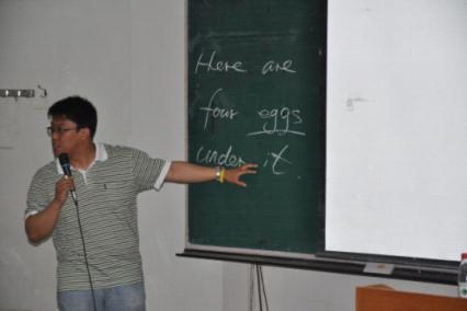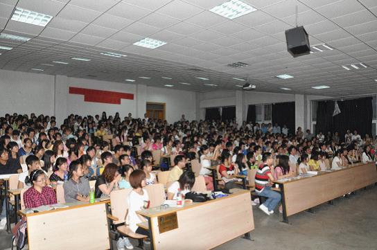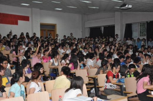 两位老师妙语连珠、激情飞扬,场上场下互动热烈,观众席上不时爆发阵阵掌声。整场讲座持续了近两个小时,同学们的热情异常高涨,在这间博文楼最大容量的教室中,众多同学甚至因坐席爆满而宁愿在教室的后排与过道处站立听完了讲座。最后,新东方英语还将带来的英语学习资料以现场抽奖的形式提供给了10位幸运同学,鼓励他们努力提高外语水平。