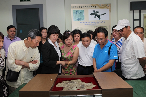 “赫氏近鸟龙”化石前驻足观看
