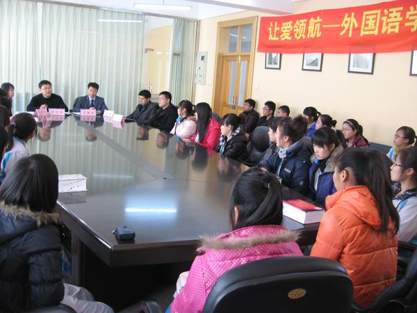 11月22日中午12:30,外国语学院举行“让爱领航”爱心超市活动,向全体特困生发放御寒衣物。学院党总支书记、副院长邵学军老师,党总支副书记、副院长王艳彪老师,团委书记、07级专职辅导员崔宁宁老师,08级专职辅导员张博老师及09级专职辅导员张帆老师出席了活动。学院2010级的全体特困生参加了本次活动。