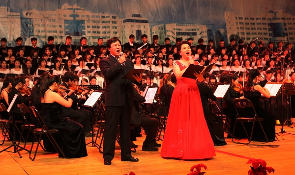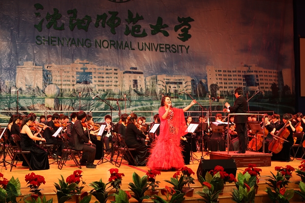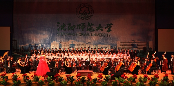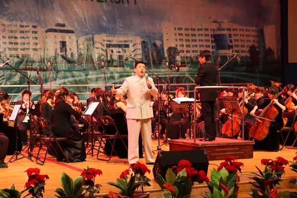 本次音乐会首场节目是气势磅礴的交响大合唱《祖国颂》和《在灿烂的阳光下》。由学校教授合唱团、音乐学院青年合唱团、校青年交响乐团联袂演出。两篇铿锵宏大的乐曲带着观众走进了一幅又幅壮丽而广阔的画卷:大家似乎闻到了祖国山河的泥土香,感到了照在心上的阳光暖。这动人心弦的演出使得音乐会在开场就进入了一个高潮。接着又分别演出了由田军教授、王英奎教授领唱和朗诵,青年教师李月演唱的《江山》,羡涛老师演唱的《乡音乡情》,徐幸老师演唱的《远情》,她们将观众带入了一个又一个音乐的唯美之境。而由青年交响乐团演奏《超级玛莉》更是将音乐会推至了最高潮,赢得了观众经久不息的掌声。最后,整场音乐会在《奥菲欧》序曲中完美谢幕。