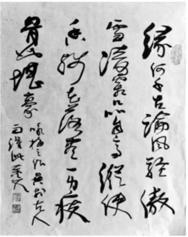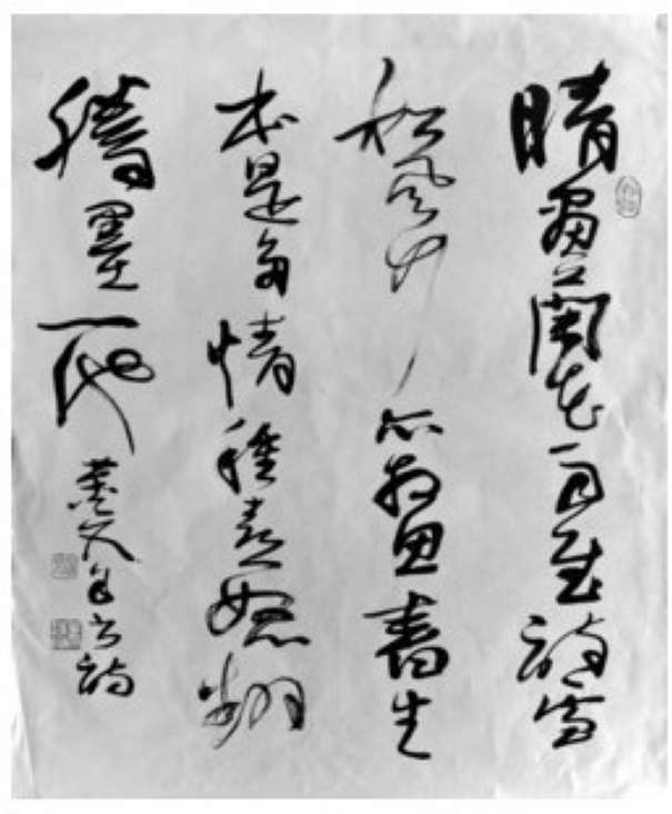 “无情未必真书家,守静致虚穷物华。抱朴斋中参众妙,解衣般礴播烟霞。出古方知入古深,鼎盘碑刻邈风神。多元取向开新路,清水芙蓉醉率真。蓦地黑云海上升,雷师雨伯御骄龙。倏忽丽日斜晖笑,丽丽发光有歌声。金星飞迸溅苍穹,慧木终谐狂吻拥。岚霭渲空色色色,水空一色空空空。 ”