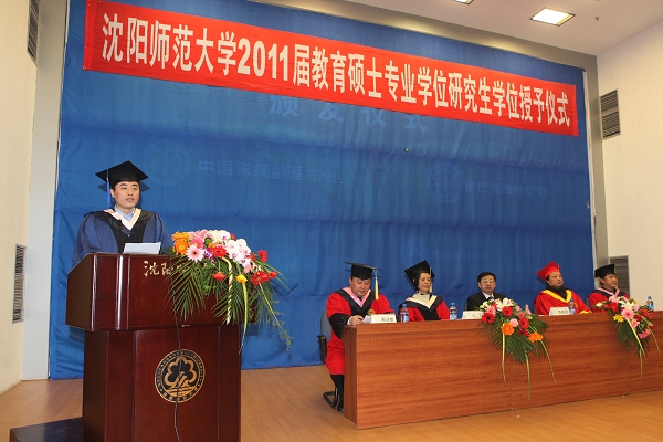 教育科学学院2007级教育管理专业孙戈同学代表毕业生发言。在发言中对学校的培养和导师的悉心指导表达了诚挚的谢意,对老师严谨的治学态度和求真务实的科研作风表达了由衷的敬意,表示要在各自的工作岗位上牢记“博学厚德,尚美健行”的校训,努力工作,不辜负领导和老师的期望,以实际行动为母校增光添彩。
