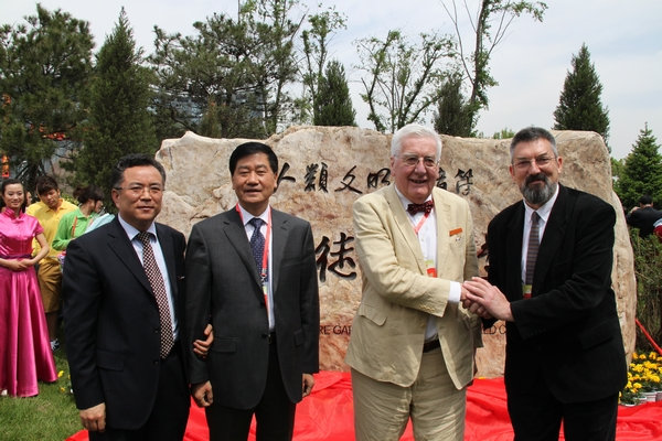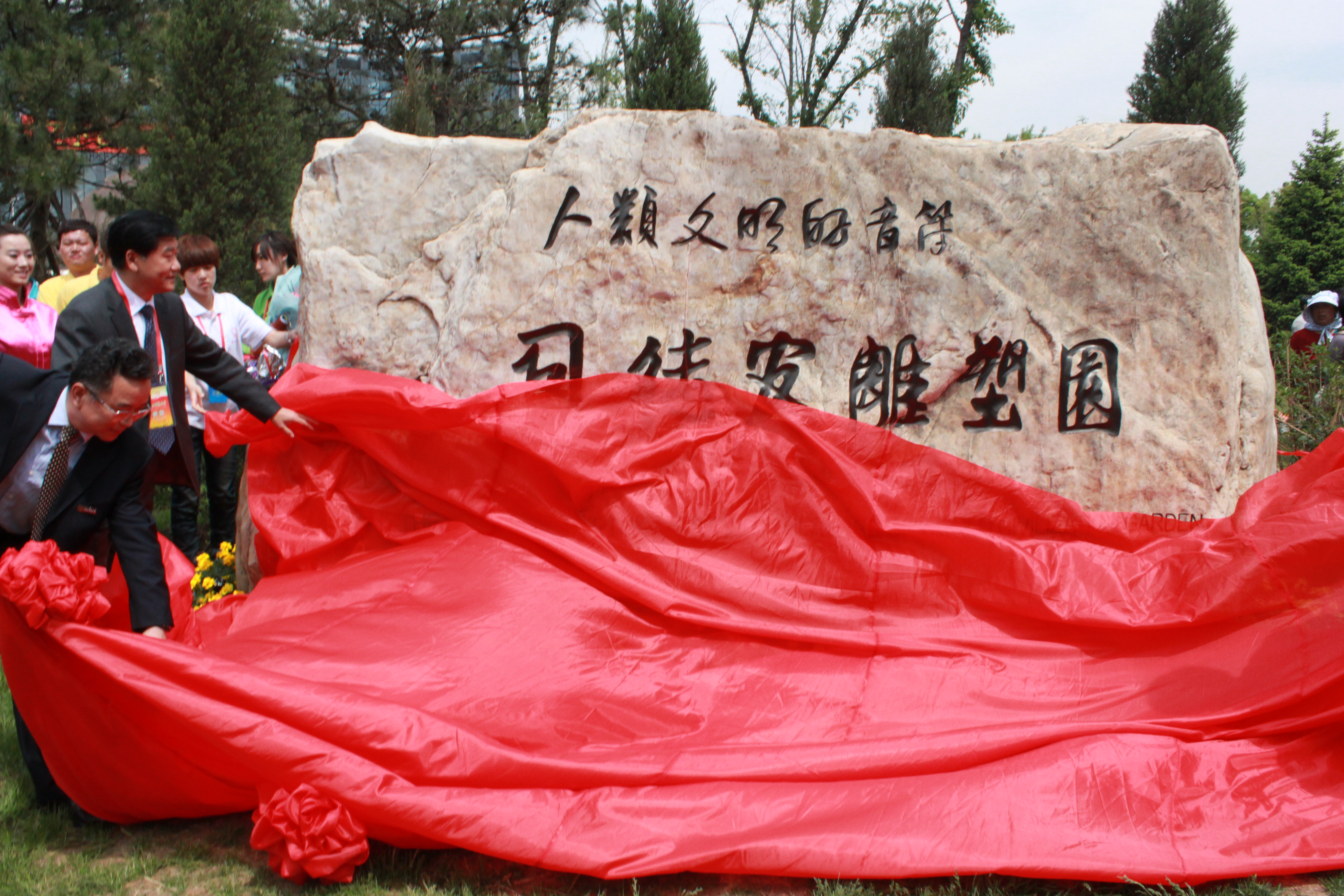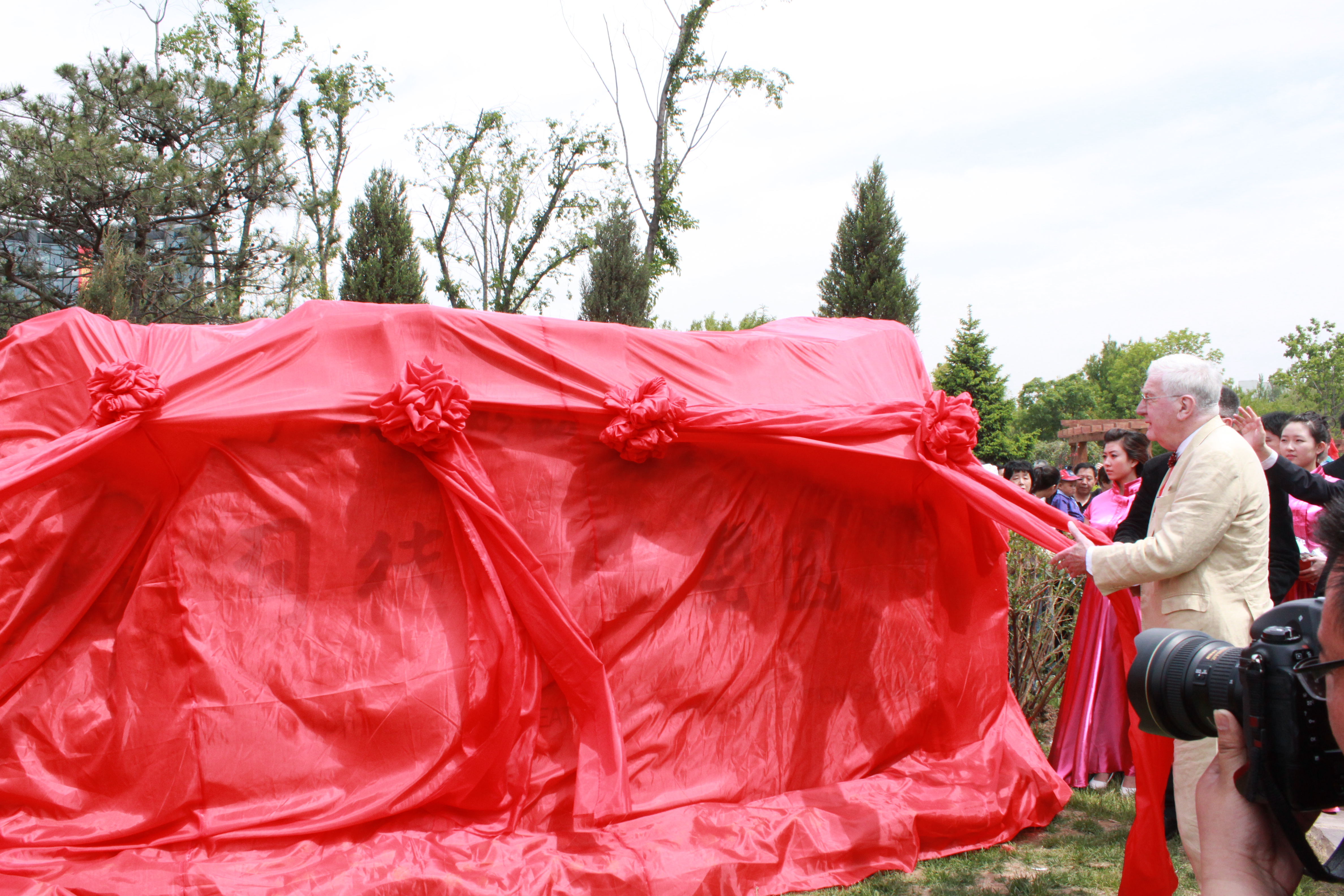 校长赵大宇、大连理工大学党委书记张德祥和雕塑园作者、司徒安国际雕塑学院院长司徒安、英国皇家雕塑家协会主席斯达姆先生一起为雕塑园揭幕。随着火红的幕布缓缓落下,园内响起了热烈的掌声。