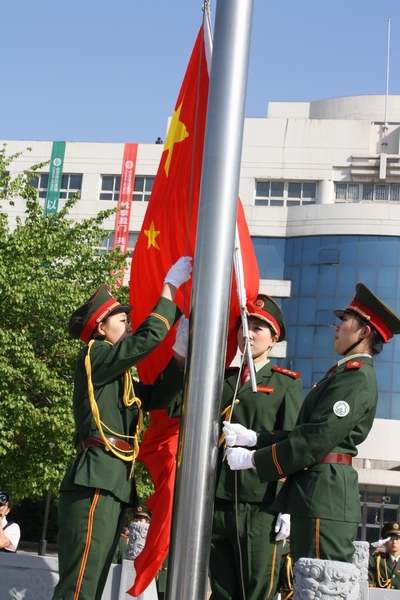 在清晨的阳光下,国旗仪仗队迈着矫健的步伐,以飒爽的英姿护送五星红旗进入广场。随着一声令下“升国旗,奏国歌!”,雄壮的《义勇军进行曲》响起,升旗手振臂一挥,鲜艳的五星红旗冉冉升起。数千名师生齐向庄严的五星红旗致以最崇敬的注目礼。迎风招展的五星红旗饱含着必赢官网师生对祖国的深厚情谊和对沈师的热爱,也飘扬着全校师生的激情与信心。
