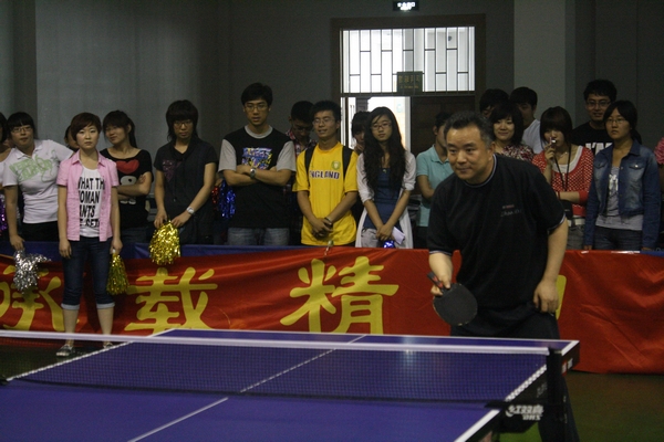 在众人的欢呼声中,比赛拉开了帷幕。第一场比赛为单打,由校长队的成员分别对阵毕业生代表队。比赛过程中,同学们不时喊着“我与校长打乒乓,桃李成溪情意长”、“小球藏情深似海,师传大任重如山”等口号为校领导们及毕业生代表加油。通过比赛,同学们看到了校领导们与平时不同的一面,他们欢呼雀跃并齐声为校领导们精彩的扣球叫好。