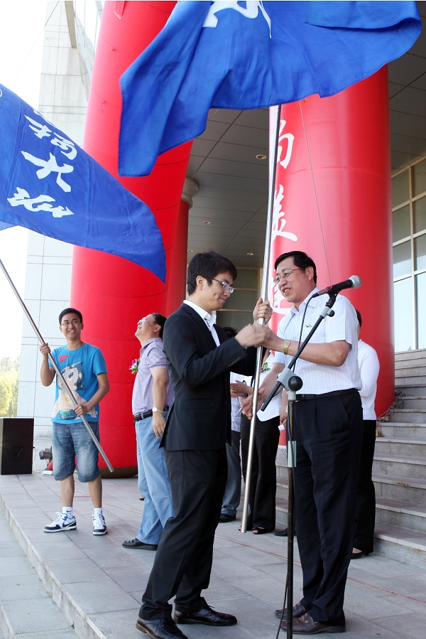 副校长夏敏向实习生授旗,蓝色的校旗迎风飘扬,是一种召唤,更是一种信念。
